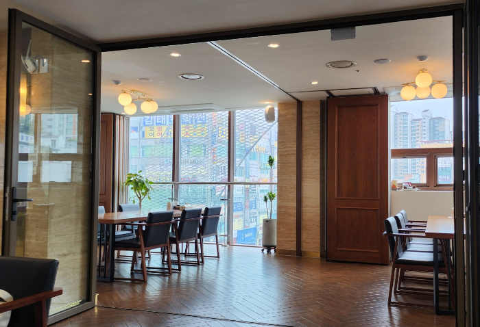 엘베를 타고 올라간 6층, 힐링밥상- 정갈하고 너른 실내가 고급지다.