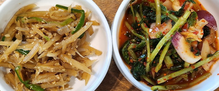 군더더기없이 우엉볶음과 자색양파열무김치만으로 상이 차려졌다.