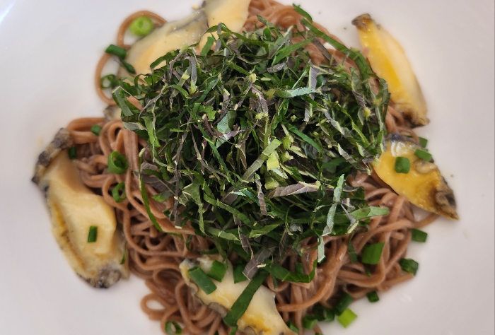 들기름막국수라선가 토핑이 채썬 들깻잎~ 맛은 쏘쏘, 전복은 나름 부드러웠다.