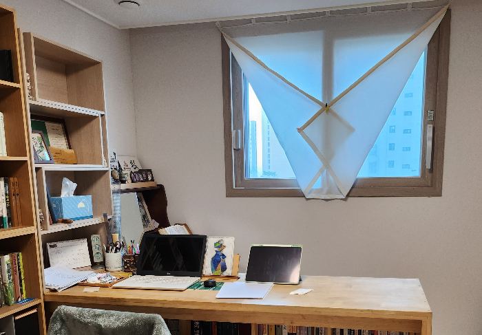 벽을 향해 있던 책상도 창을 바라보는 자리로 잘 옮겨 1차 정리가 되었다.