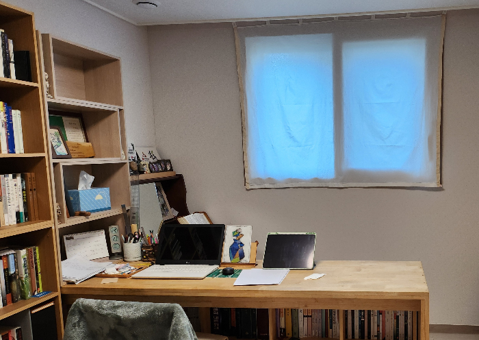 안방 장농 옆 공간에 작은 책상, 벽면에 책장을 둔 채 안방을 침실 겸 내 서재로 써왔지.