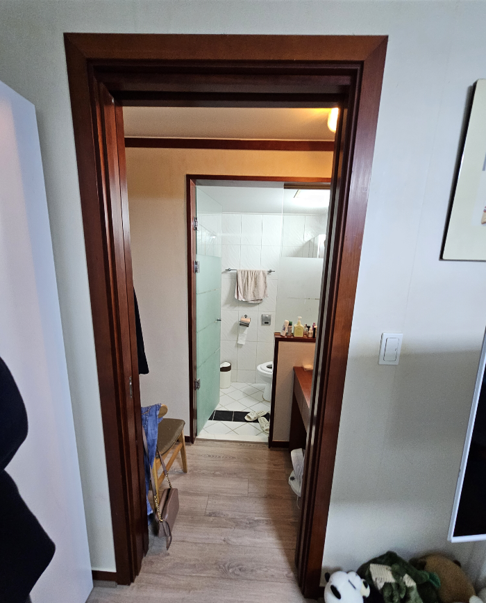 화장대쪽의 가벽과 유리 파티션은 조적벽으로 정리하고 출입문 간섭은 슬라이딩도어로 교체해 문제 해결?