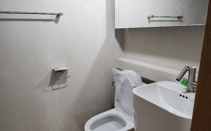 화장실은 천정과 도기류까지 설치가 돼 이제 전기 조명작업만 하면 되고,