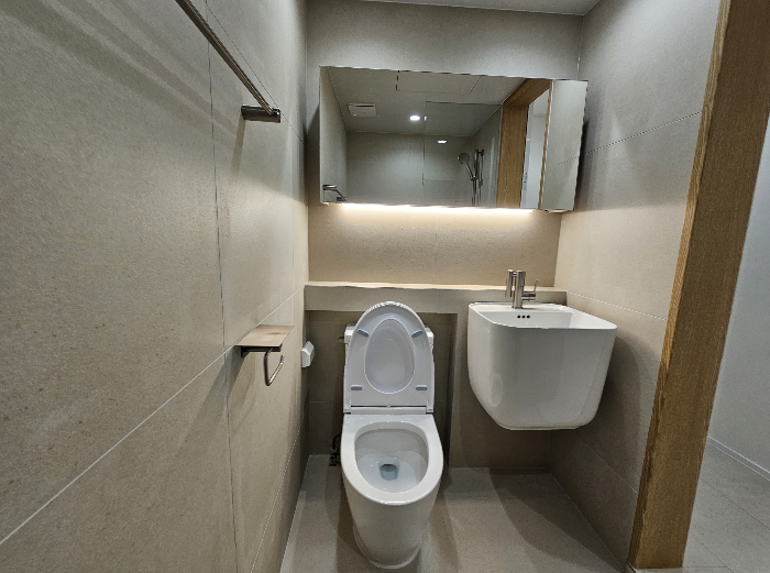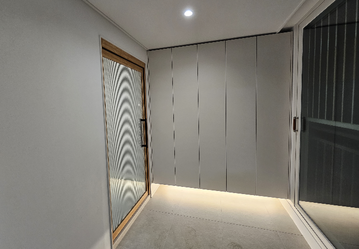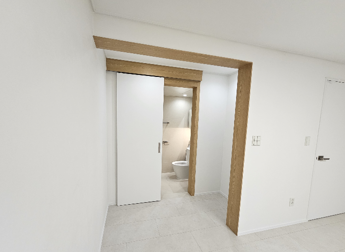 안방화장실 출입문을 사이로 벽 한면은 유리라 결국 그곳도 손을 대 가벽처리를 했잖아~